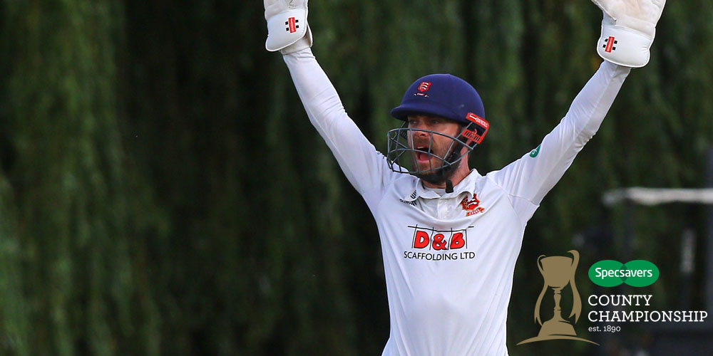 Wayne Madsen and Neil Broom added 43 during which time Madsen became the first player from Division Two to complete 1,000 Championship runs this season but having scored 37, he fell victim to a sharp catch by Jaik Mickleburgh to give Will Rhodes his first Essex victim in his first match since joining from Yorkshire on loan.
