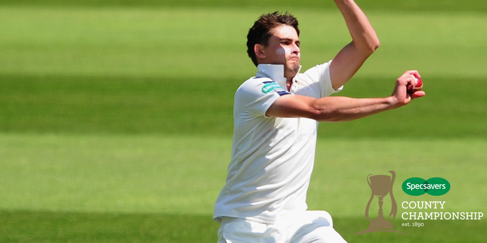 Essex’s latest signing, Will Rhodes celebrated his first wicket in an Essex shirt on Day Three against Derbyshire in the Specsavers County Championship. The loanee from Yorkshire bowling impressively at the 3aaa County Ground ending the day with 1-22 from his 13 overs which included 7 maiden overs.