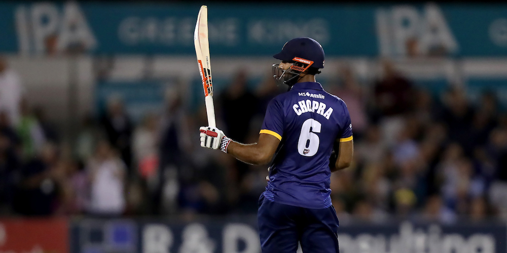 Chopra had already hammered two sixes before that in the previous over from Claydon, whose first two overs went for 46. Sixes number six and seven came off successive balls from Imran Qayyum over long leg and then straighter.