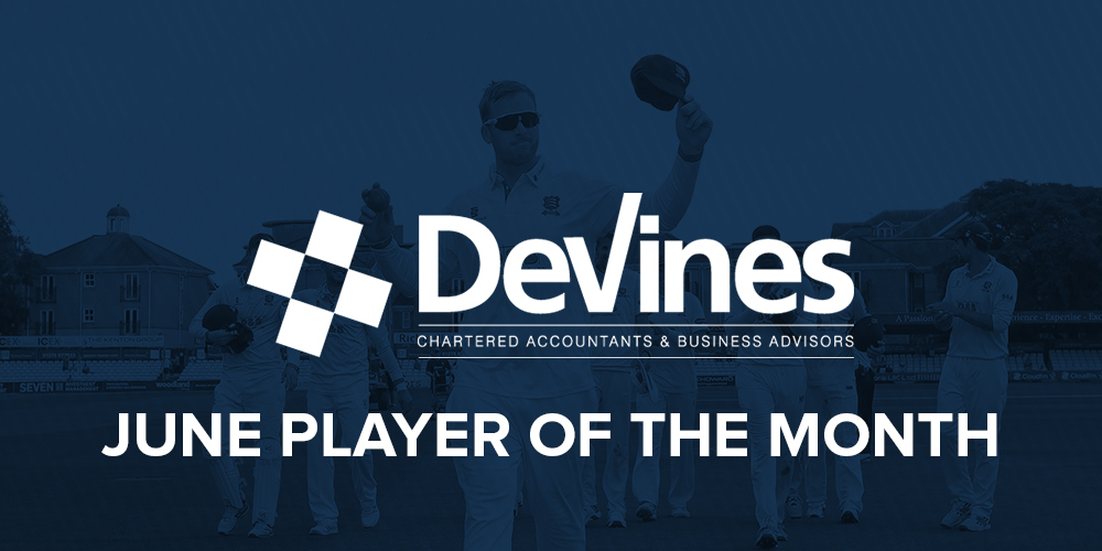 Simon Harmer has been named the DeVines Player of the Month for June, after picking up 44% of the votes, beating Alastair Cook and Jamie Porter to the award. The win completes back to back awards for Harmer.