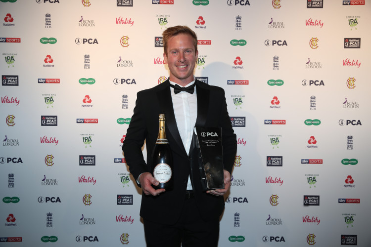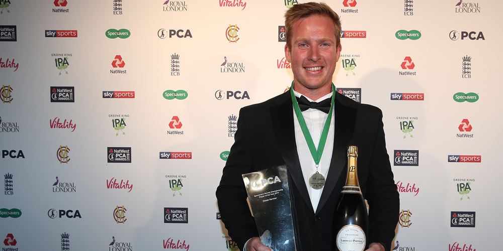 Simon Harmer’s whirlwind year continued on Wednesday evening as he picked up the PCA Specsavers County Championship Player of the Year award at the annual PCA Awards evening, held at the Roundhouse in London.