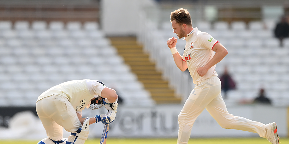 He grabbed two wickets in three deliveries. The first of that brace knocked out the off-stump of Ben Raine who had made seven although a bail flew into the face of wicket-keeper Adam Wheater who was standing up to the stumps. Fortunately, he was able to continue after receiving attention from Physiotherapist Chris Clarke-Irons.