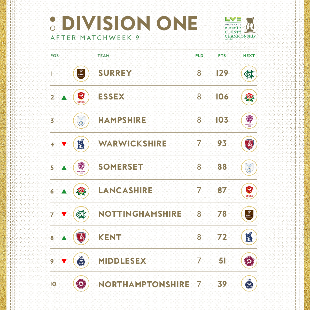 Lancashire remain the only side in Division One to have not lost a game but a record of two victories and five draws means they currently sit in sixth position on 87 points.