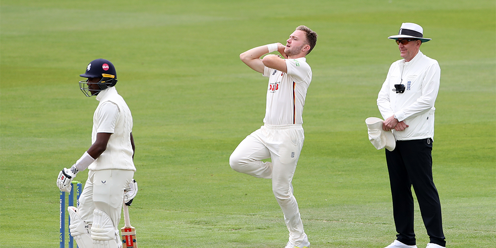 The injured Jordan Cox emerged with Twanda Muyeye as his runner. However, the helper was not required to move on Cox’s behalf as the wicketkeeper was scoreless for 16 deliveries and remained motionless on his crease when Sam Cook appealed successfully for lbw.