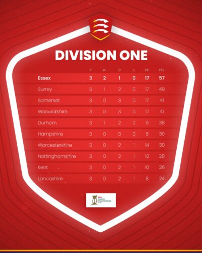 Meanwhile, in the Eagles’ sole innings, Tom Westley top-scored with 81, Dean Elgar continued his fine start to life at Essex with 79, and Feroze Khushi blasted a 33-ball 53 at the top of the order.