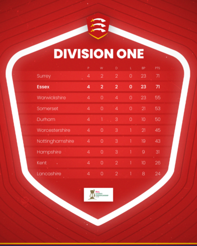 Jason Kerr’s men have taken 21 bonus points from those four games, split into 11 for batting and 10 for bowling, to sit fourth in the table, three points ahead of Durham and two behind Warwickshire, with the Eagles a further 16 ahead.