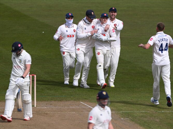 With Michael Pepper and Adam Rossington out with injuries, Yorkshire’s Harry Duke was loaned in, and he immediately endeared himself to his new teammates with a stunning low one-handed grab off Jamie Porter to remove Scott Borthwick.