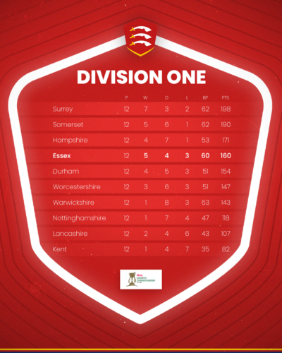 Essex had earlier posted a mammoth 457 all out, with Tom Westley striking 122, his first Championship hundred of the season, and Michael Pepper scoring 115 to continue his recent purple patch.