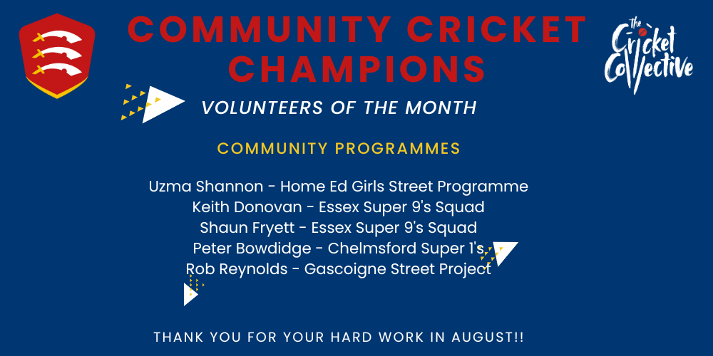 A little later than planned, the month of August looked at those who had been influential in delivering the Community projects within their clubs and community organisations as we continued with our ‘Community Cricket Champions’ programme.