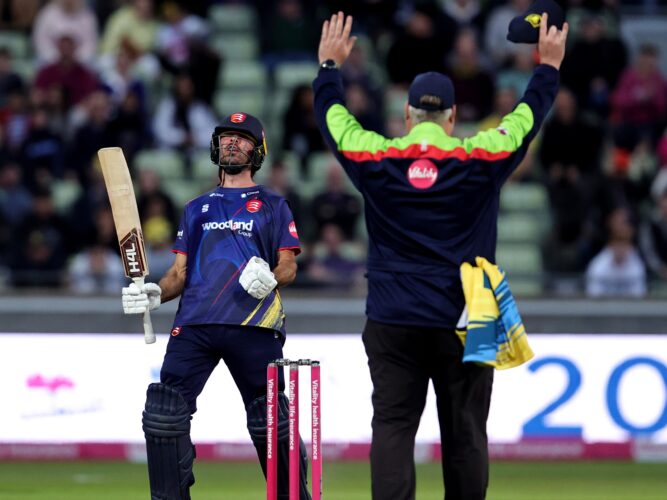 In response, captain Sam Northeast put up a valiant fight with an unbeaten 97 from 56 balls, but no one was able to match the Eagles’ fireworks as the visitors finished well short on 185-7 to give Essex victory by 69 runs.