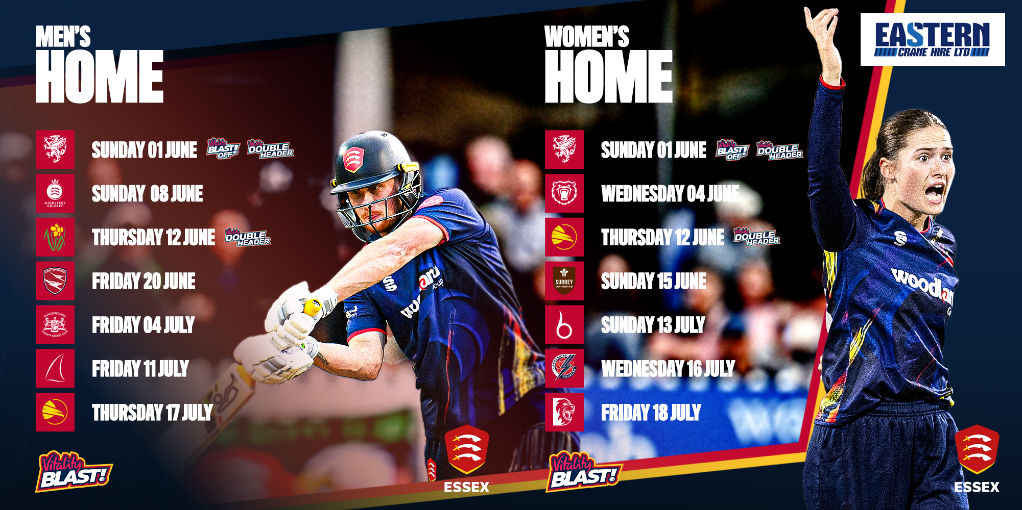 The action then moves to The Cloud County Ground, Chelmsford, for the team’s first home matches of the season, starting with a Blast-Off clash against Somerset on Sunday 01 June, followed by another exciting double-header against Glamorgan.