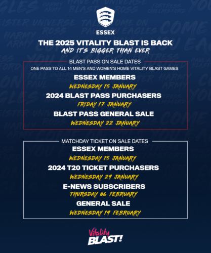 Essex Members and supporters will have the chance to buy Blast Passes and matchday tickets as they go on sale this month, with Essex Members’ priority window opening next Wednesday 15 January. See below for a full list of on sale dates or click here to view on sale dates and ticket prices.