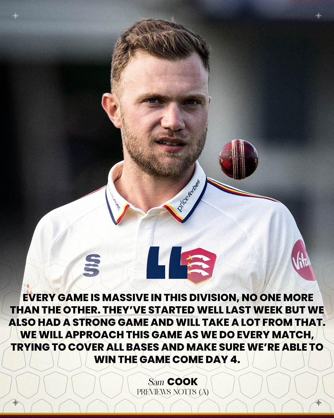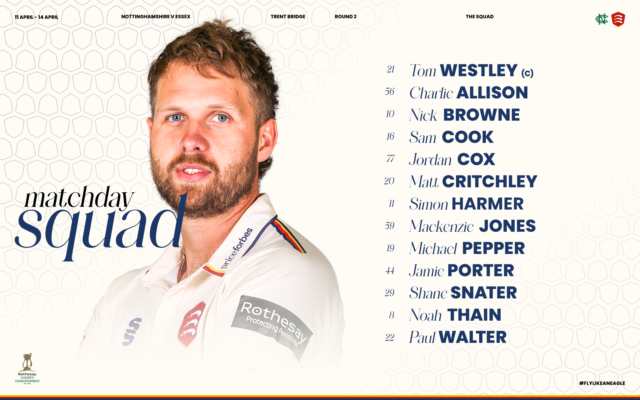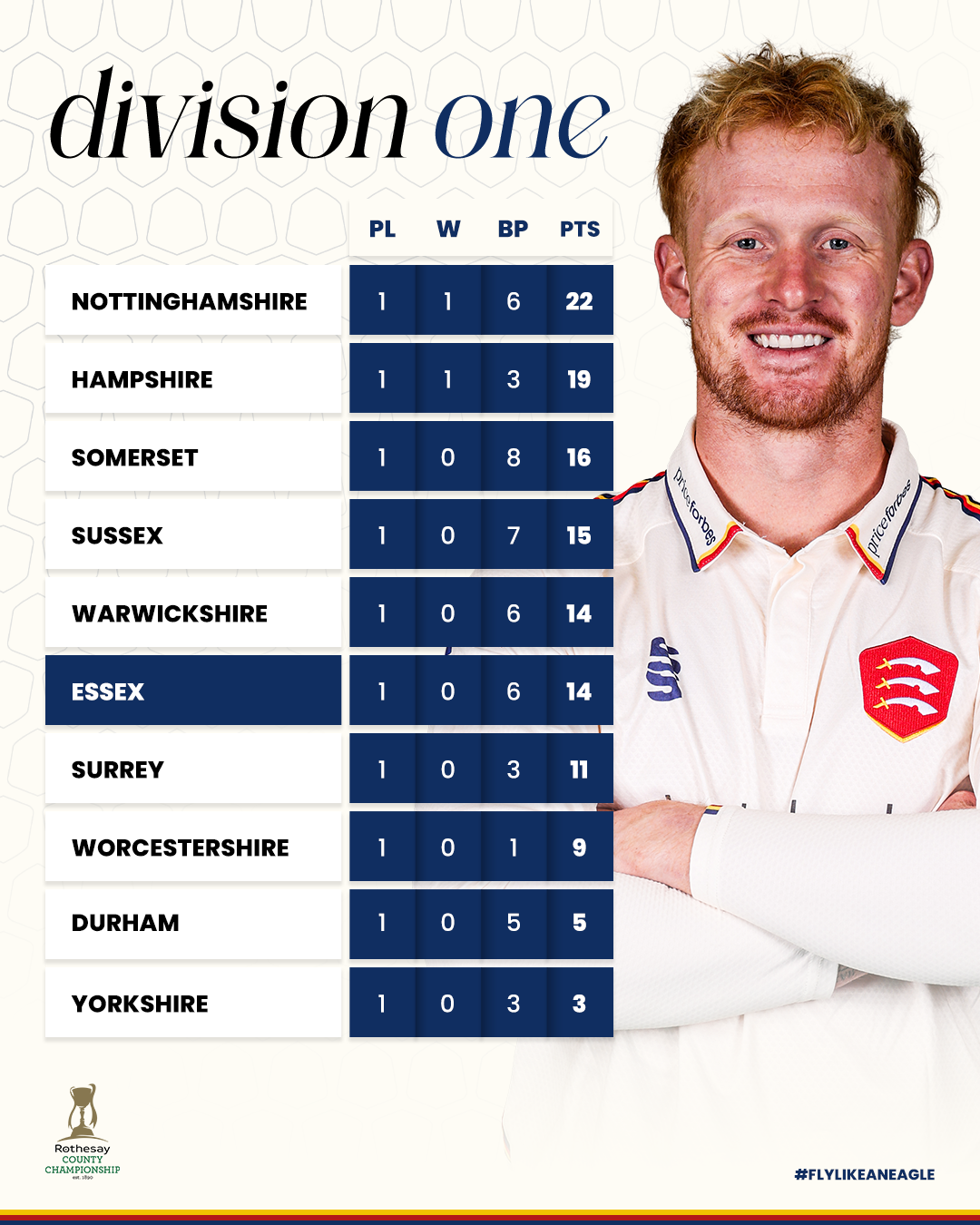 Critchley’s Player of the Match performance against Surrey saw him carry his bat in the first innings with a superb knock of 145*, as Essex featured three centurions. Jordan Cox contributed 117 and Michael Pepper added 109, helping the Eagles secure four batting points. New opener Paul Walter also impressed, narrowly missing out on a century with a solid 95.