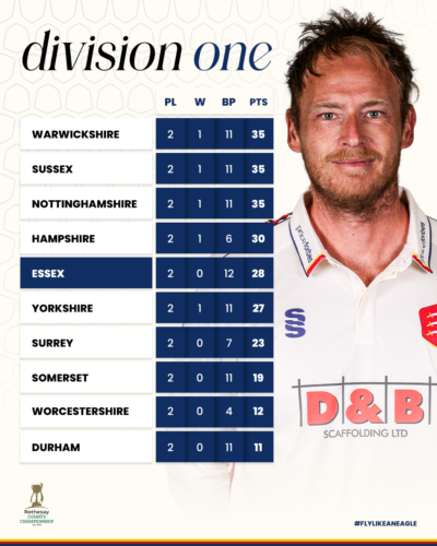 It was at that point, however, that the chase began to slip from the hosts’ grasp, as Westley, Das, and Jordan Cox all fell before lunch to leave Essex 75-4, still 109 away from winning.