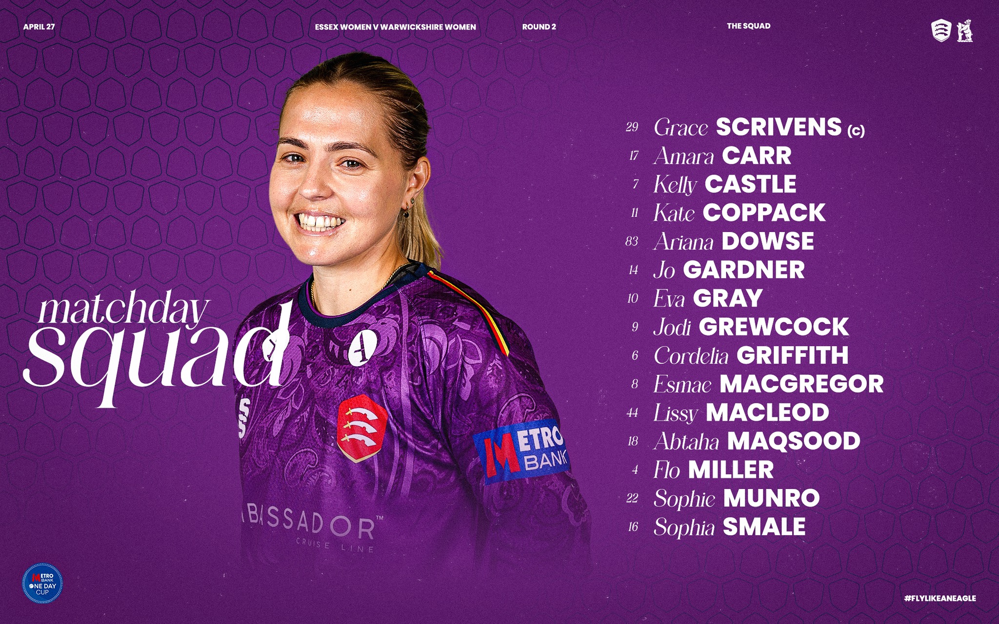 Team Director Andy Tennant has selected a 15-player squad for this weekend’s home fixture that features Sophia Smale, who top scored with the bat for the Eagles against Durham Women.