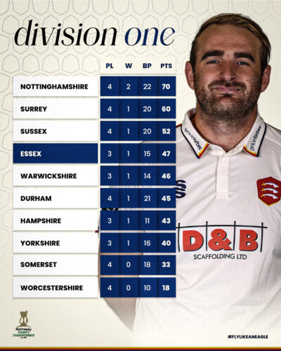 The Eagles fought back with the ball after a tough start with the bat, restricting Worcestershire to 202. Essex debutant and Sri Lankan overseas signing Kasun Rajitha impressed with figures of 4/52 as Jamie Porter, Shane Snater, and Noah Thain each took two wickets as the Pears claimed a narrow 23-run lead heading into the third innings.