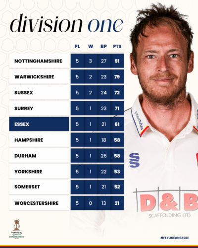 Worcestershire sit in tenth place on 21 points whilst Essex are placed in fifth with 61 points.