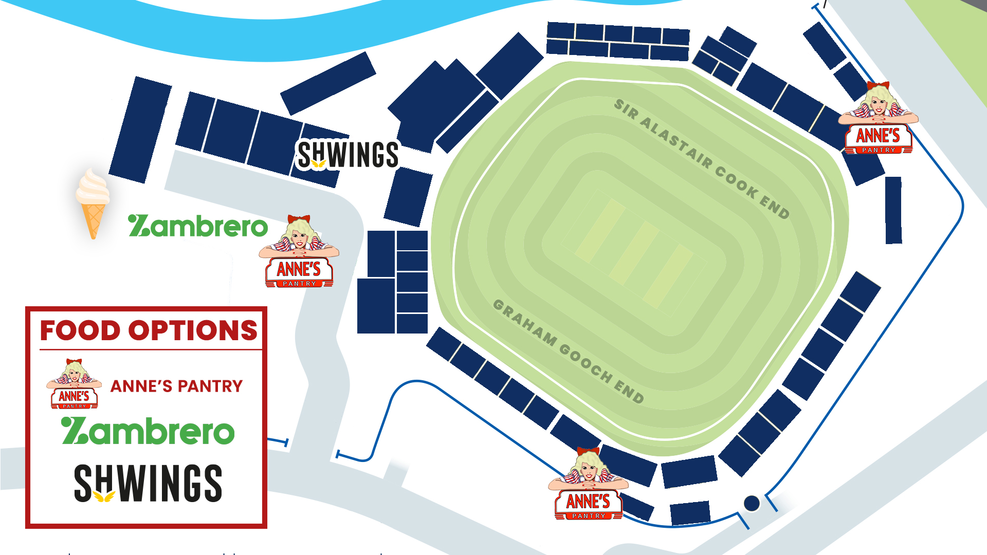 • The Food Court is located in the blue area of the ground by the Essex Cricket Store where Anne’s Pantry will be offering a variety of food. Anne’s Pantry food kiosks will also be offering a choice of hot meals, cakes/snacks, and drinks from their other outlets located at the Graham Gooch End and Sir Alastair Cook End.