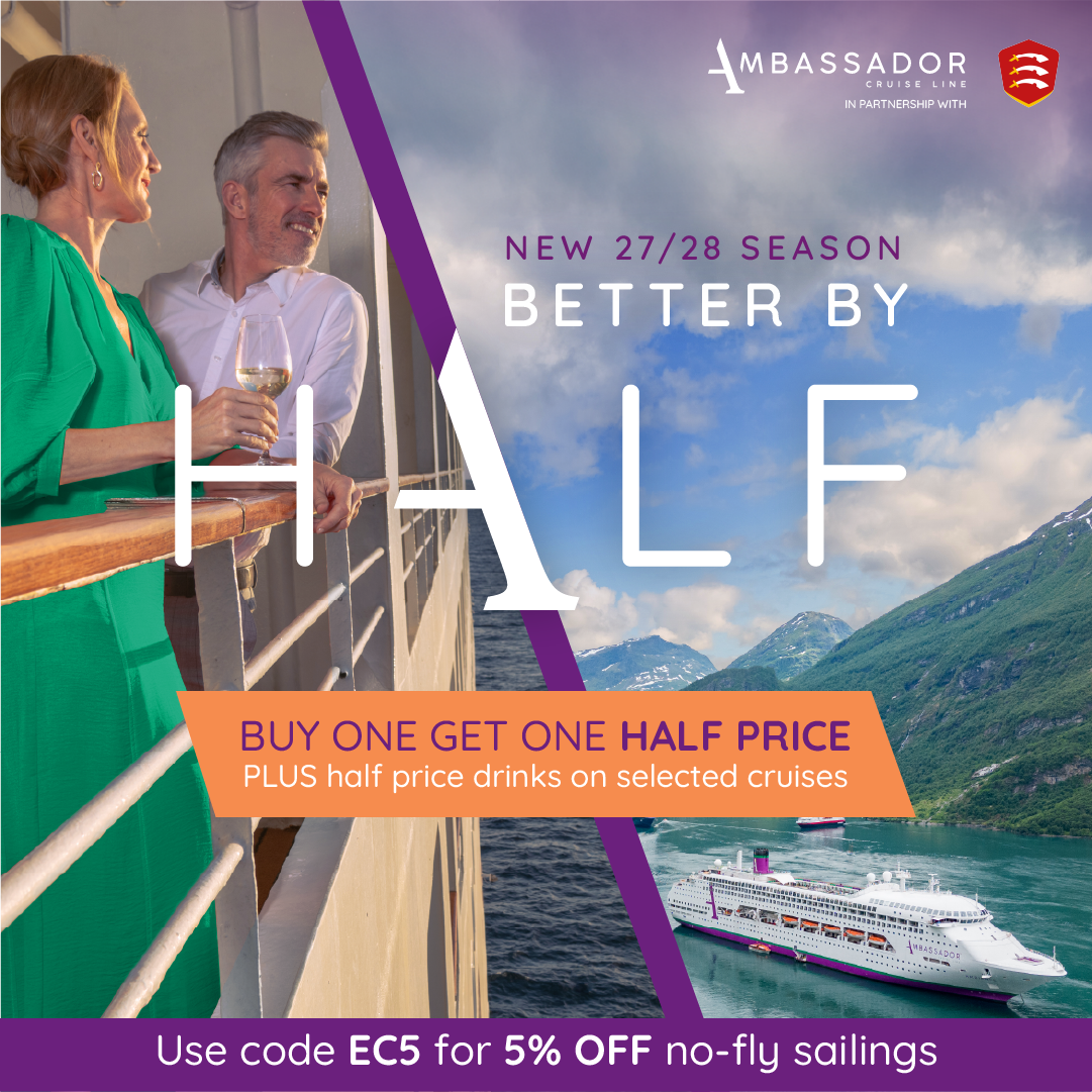 Take advantage of Ambassador’s Buy One, Get One Half Price offer on selected 2027 and 2028 sailings. Simply book your cruise and the offer will be applied automatically, with the first guest paying full price and the second guest travelling for half price.