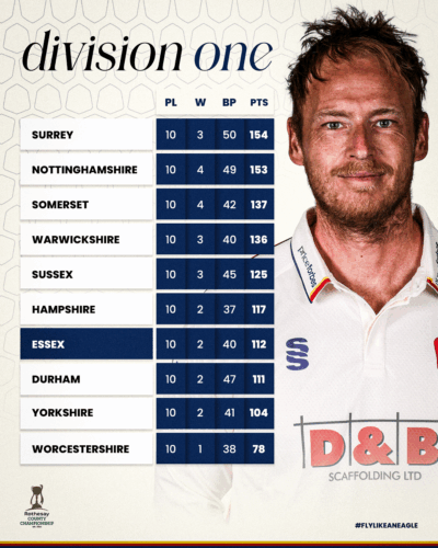 The final day lasted just 25 minutes. Coles reached his century but was eventually dismissed for 108, falling to Harmer. Critchley wrapped up the innings with figures of 4 for 41, sealing an emphatic innings victory for Essex. With their full-strength bowling attack finally available, Essex controlled the match from the first session to the last and now look well-placed to climb the Division One table in the remaining rounds.