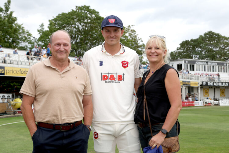 Michael Pepper with his parents during his cap presentation at the lunch interval on Day 2 between Essex and Warwickshire in the County Championship, 30 July 2025.