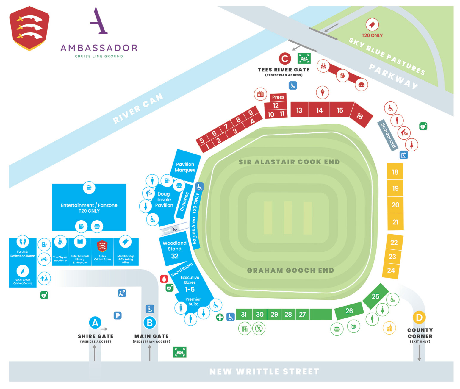 Spectators are able to enter the ground via the Main Gate located on New Writtle Street or through the Tees River Gate. Please enter through the gate nearest your seat location.