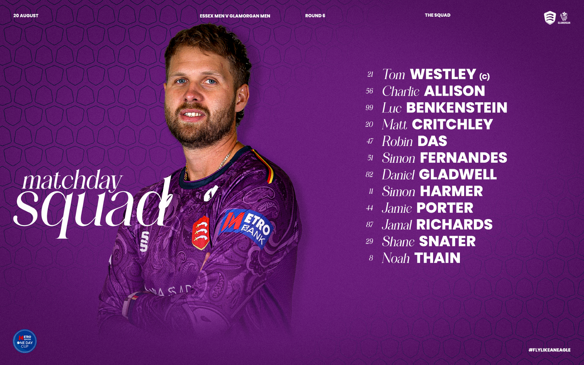 Glamorgan: Eddie Byrom, Will Smale (WK), Sam Northeast, Kiran Carlson (C), Billy Root, Asa Tribe, Tom Bevan, Dan Douthwaite, Andy Gorvin, Jamie McIlroy, Ben Morris.