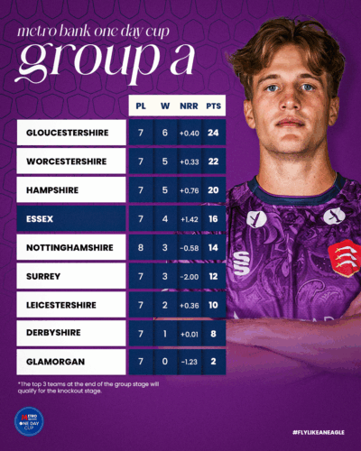 A place in the knockout stages is still up for grabs, with a potential away quarter-final on Thursday if the Eagles defeat Derbyshire and results elsewhere go their way. A quarter-final spot would belong to Essex should Gloucestershire beat Hampshire, with Essex having a far better net run rate compared to Hampshire.