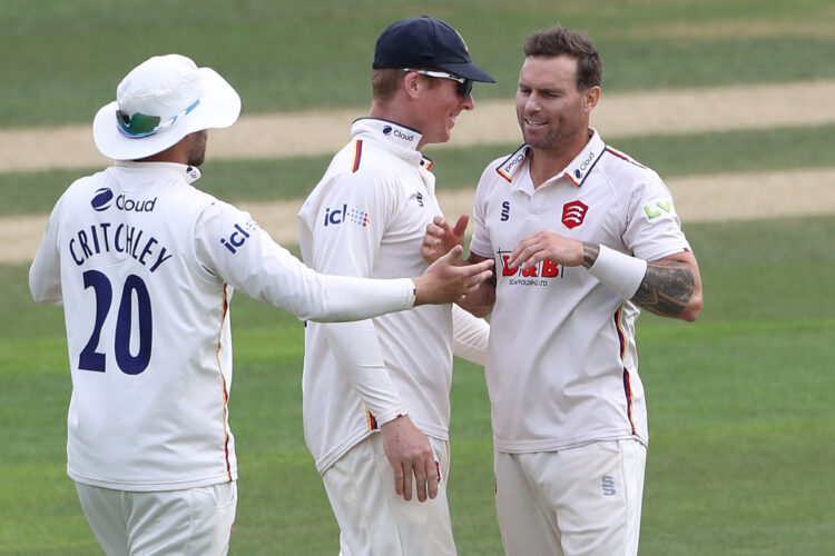 Doug Bracewell of Essex celebrates with his team mates after taking the wicket of Joey Evison during Essex vs Kent, County Championship Division One at Chelmsford on 19th July 2023.