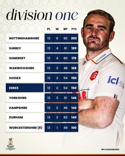 Day 3: Cox went on to a fine century but retired hurt on 103, and Essex’s last six wickets tumbled for seven runs, leaving them 259 all out. Even so, a target of 321 looked strong, and early strikes from Cook, Porter and Harmer reduced Somerset to 91/5. James Rew (65*) and Lewis Gregory counter-attacked, but Essex still began the final morning needing just four wickets.