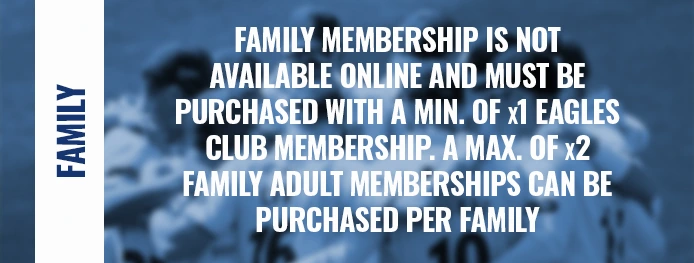Family Memberships are not available online & must be purchased with a min. of x1 Eagles Club Membership. A max. of x2 Family Adult Memberships can be purchased per family.